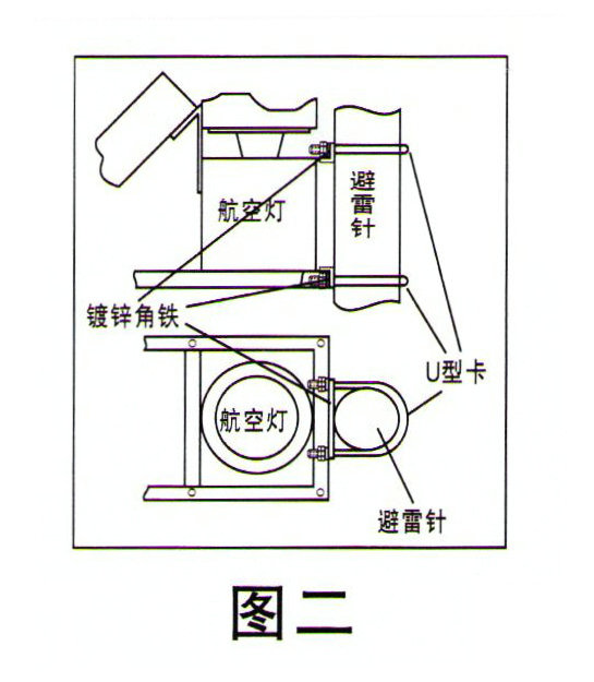 航空障礙燈平臺式安裝方法:由底板4個孔,用M10X40螺栓固定航空障礙燈即可。也可用U型卡子直接卡在避雷針上。安裝圖如下: